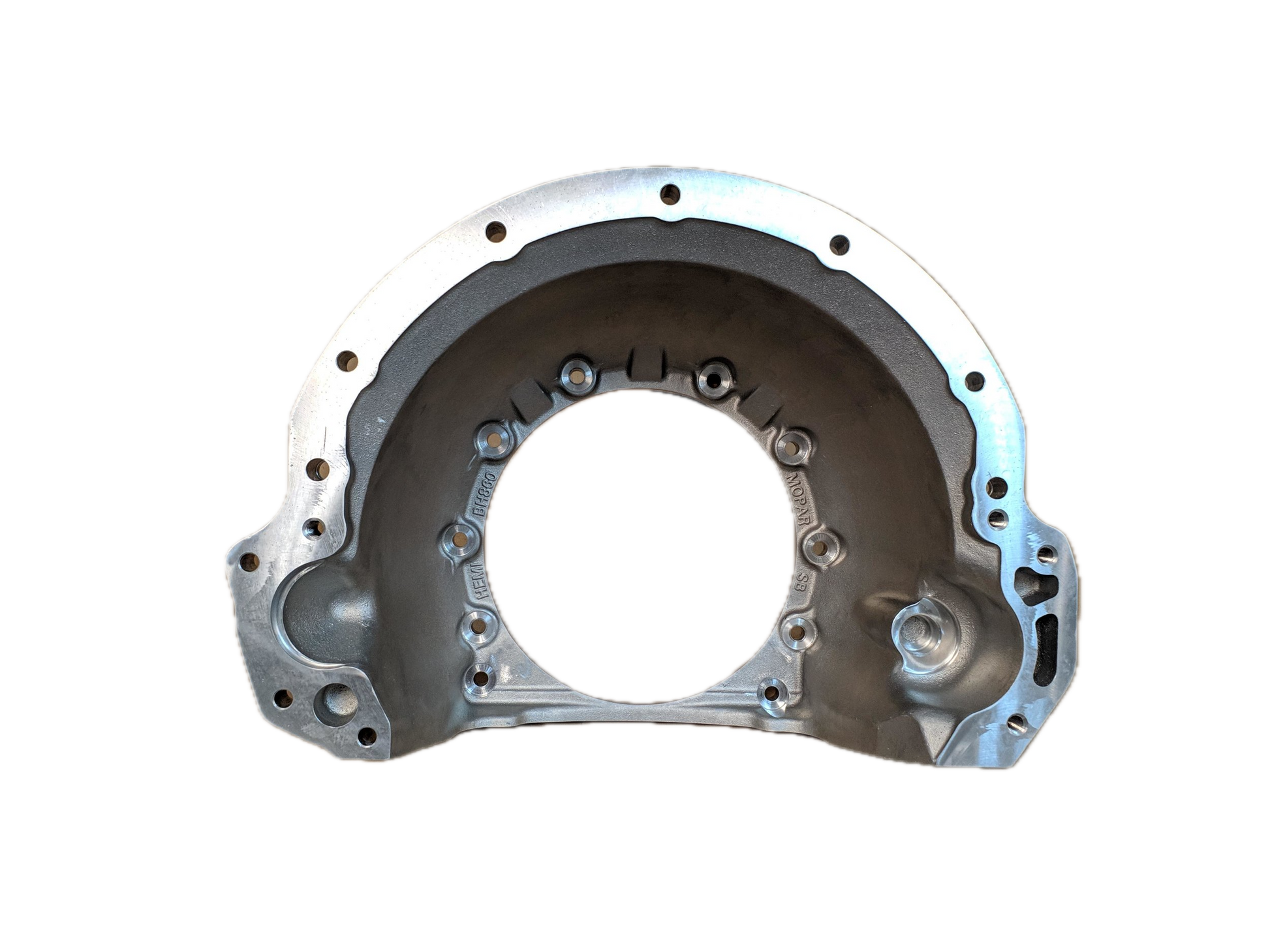 Designed for use with 130 tooth flexplate. Dual starter pockets allow use of driver's side SB starter or passenger side GEN III HEMI starters. Starters are in the stock location.